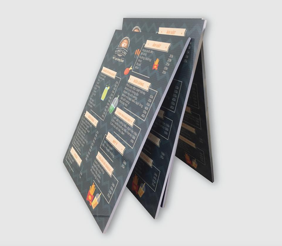 Menu gấp ba là một dạng menu được in ấn trên giấy có thể gấp lại thành ba phần bằng nhau. Điều này giúp cho khách hàng dễ dàng xem và lựa chọn các món ăn mà không cần phải mở toàn bộ menu, giúp tiết kiệm thời gian và tăng tính tiện lợi. Menu gấp ba được sử dụng trong các nhà hàng, quán ăn hoặc quán cafe có không gian hạn chế và thường được sử dụng rộng rãi trong các buổi tiệc cưới, sự kiện và hội nghị.