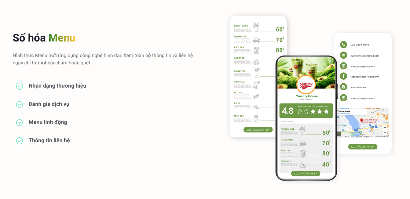 Menu thông minh là một nền tảng giúp các nhà hàng, quán ăn, khách sạn... tạo ra một menu điện tử cho khách hàng. Khách hàng có thể truy cập menu này thông qua link, quét mã QR hoặc chạm NFC. Menu thông minh giúp tiết kiệm thời gian cho khách hàng và cho nhân viên phục vụ, đồng thời tăng tính hiện đại, chuyên nghiệp cho hoạt động kinh doanh.